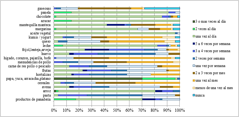 Asimismo, se determinó la frecuencia de consumo de alimentos (figura 3) que hacen parte de la dieta de una persona. Para el consumo diario se evidencia que el alimento más consumido es la papa con una frecuencia de 3 o más veces al día. Paralelamente se determinó que los alimentos de menor consumo diario son: mantequilla o manteca, aceite vegetal, kumis o yogurt, granos (frijol, lenteja y arveja), huevo, proteína animal, frutas, hortalizas, cereales, avena y pasta, con una frecuencia de consumo de 1 vez por día. En cuanto el consumo semanal la población consume mantequilla o manteca con una frecuencia de 5 a 6 veces por semana, asimismo alimentos como la panela, el chocolate son consumidos por la población con una frecuencia de 3 a 4 veces por semana. Los alimentos de menor consumo semanal son el queso, cereales, hígado, bofe, pajarilla y corazón, con una frecuencia de consumo de una vez al día y para el consumo mensual se evidencia un consumo de pasta con una frecuencia de 3 o más veces por mes, en cambio se observa una frecuencia de consumo de una vez por mes para alimentos como: kumis o yogurt, mantequilla o manteca, queso, aceite vegetal, granos, huevo, proteína animal, frutas, hortalizas, cereales, avena y pasta.