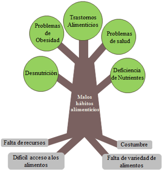 En el árbol de problemas de seguridad alimentaria (figura 4), en el tronco del árbol (problema central), se ubicaron los malos hábitos alimenticios. La comunidad afirma que la mayoría de los habitantes “comen suficiente, pero muy poco variado y la mayoría de veces no es balanceado porque se come lo mismo” (Entrevistado 23, comunicación personal, abril de 2017). Posteriormente se ubicaron las principales causas en las raíces, la primera raíz identificada es la costumbre, debido a que siempre se ha tenido la cultura de comer bastante pero poco variado y balanceado. La segunda raíz es la falta de recursos económicos, aseguran que es la escasez de dinero uno de los impedimentos para la mejora de los hábitos alimenticios, debido a que “únicamente les alcanza para lo básico” (Entrevistado 23, comunicación personal, abril de 2017) y que muy pocas veces se pueden “dar el lujo de consumir verduras, vegetales o frutas” (Entrevistado 23, comunicación personal, abril de 2017). La tercera y última raíz tiene que ver con el difícil acceso a los alimentos y la falta de variedad de los mismos. La comunidad manifestó que se debe desplazar hasta las plazas de mercado ubicadas en Tunja o en los municipios aledaños para adquirir ciertos alimentos, lo que muchas veces los limita al momento de consumir ciertos alimentos.