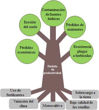 Para el árbol de problemas de sostenibilidad ambiental en el componente agropecuario (figura 5) en el tronco se ubicó la pérdida de productividad, que se ha visto reflejada en los últimos años, repercutiendo directamente en los ingresos económicos de las familias. Las causas identificadas se ubicaron en las raíces. La primera raíz es el uso de fertilizantes, debido a que se genera dependencia al uso de estos para conseguir un alto rendimiento de los cultivos. La segunda raíz identificada es la variación del clima, ya que la productividad y rentabilidad de los cultivos se ven directamente afectadas por las variaciones climáticas, lo que concuerda con lo expuesto por la FAO (1997) que considera que la variabilidad natural de las lluvias, de la temperatura y de otras condiciones del clima es el principal factor de la variabilidad de la producción agrícola. La tercera raíz es la baja calidad de las semillas, la comunidad tiene la percepción de que actualmente las semillas empleadas “no son de la misma calidad que las semillas de antes” (Entrevistado 23, comunicación personal, abril de 2017); adicionalmente aseguran que se han perdido gran variedad de semillas nativas de la región por motivos económicos ya que “siembran la variedad de papa que más les produzca” (Entrevistado 13, comunicación personal, abril de 2017). La cuarta raíz es la sobrecarga a la tierra, esto se presenta por no otorgarle al suelo periodos de descanso o por el uso de maquinaria pesada (tractor) para el alistamiento del terreno. La última raíz es la implementación de monocultivo, la mayoría de los cultivos se desarrollan bajo este modelo.