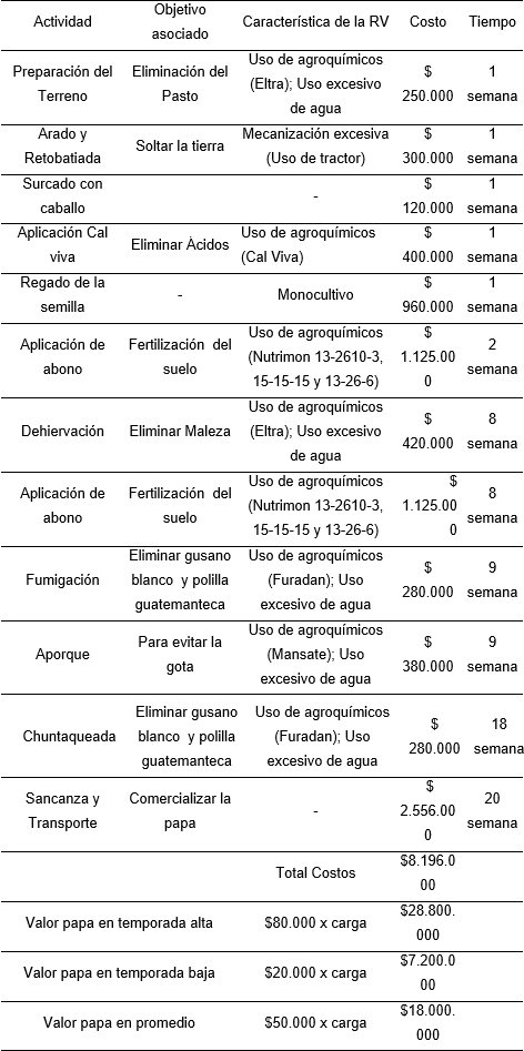 Seguido al corte transversal se realizó un Flujograma de producción (tabla 1) en el cual se identificaron actividades, costos, tiempos e insumos asociados a la producción de papa que es el cultivo más representativo.