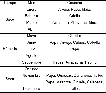 Igualmente se desarrolló un calendario agrícola (tabla 2), el cual permitió analizar la temporalidad en la cual la comunidad tiene a disposición los alimentos cultivados, tomando en consideración los periodos secos y periodos de lluvia. Los meses de mayor disponibilidad de alimentos son: enero, marzo, junio, septiembre, noviembre y diciembre, en los cuales se tiene cosecha de arveja, papa, maíz, zanahoria, ahuyama, mora, cebolla, habas, arracacha, cubios, pepino, guascas, calabaza, tallos y ciruela. Por el contrario, los meses de baja disponibilidad de alimentos son: abril, agosto y octubre, en los cuales no se cuentan con alimentos disponibles para el consumo.