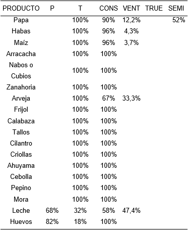 Con los resultados del cuestionario estructurado se evidencia que los productos de consumo en la Vereda Huerta Grande (tabla 3) son: papa, haba, maíz, arracacha, nabos, zanahoria, arveja, frijol, calabaza, tallos, cilantro criollas, ahuyama, calabaza, cebolla y pepino, de los cuales la papa, haba, maíz, arracacha, zanahoria, arveja, criolla, mora y leche son empleados para la venta. La comunidad considera que todos los alimentos, a excepción de los huevos y la leche, son temporales; alimentos como la papa, maíz, arracacha, zanahoria y criolla son usados como semillas para próximas cosechas, los habitantes aseguran que en la actualidad no se realiza intercambio o trueque de alimentos.