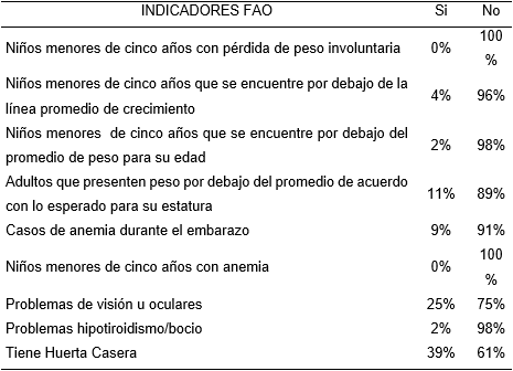 Al continuar con los factores considerados por la FAO (2015) en cuanto a la dimensión de utilización se encontró lo siguiente: i) en la vereda Huerta Grande ningún niño presenta pérdida de peso involuntaria ii) el 4% de los niños menores de 5 años se encuentran por debajo de la línea promedio de crecimiento, iii) el 2% de los niños menores de 5 años se encuentran por debajo del peso recomendado para su edad, lo cual es bajo con respecto al 3.4% de niños por debajo del peso ideal a nivel nacional MPS y ICBF (2011), iv) el 11% de los adultos se encuentran por debajo del peso esperado para su estatura lo cual es una cifra alta comparada con el 2,8% a nivel nacional para el año 2010, MPS y ICBF (2011), v) ninguna mujer ha sufrido anemia durante el periodo de gestación, lo cual es un indicador bueno en comparación con las zonas rurales del país que para el año 2010 el 21,3% de las mujeres gestantes padecieron de anemia MPS y ICBF (2011), vi) ningún niño menor de 5 años ha padecido anemia, lo que es bajo en comparación al departamento de Boyacá que para el año 2010 el 25,7% de la niñez sufría de anemia y a nivel del país el 27,5% MPS y ICBF (2011), vii) el 25 % de los habitantes de la comunidad presentan algún problema de visión los cuales se asocian a la deficiencia de vitamina A, este porcentaje se encuentra por debajo del 39% de personas que carecen de vitamina A en el departamento de Boyacá, MPS y ICBF (2011), viii) el 2% de la población presenta problemas de hipotiroidismo y bocio, los cuales se asocian a la carencia de yodo (tabla 4).