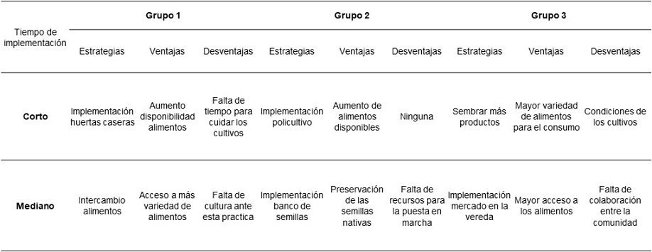 La primera estrategia propuesta por el grupo 1 fue la implementación de huertas caseras, como ventaja se identificó el aumento de disponibilidad de alimentos y como desventaja la falta de tiempo para cuidar de estas, aseguran que esta medida se podría poner en marcha a corto plazo. La segunda alternativa fue el intercambio de alimentos, la ventaja de esta alternativa es el acceso a más variedad de alimentos, como desventaja se encuentra la falta de cultura ante esta práctica.