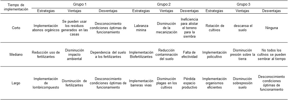 La estrategia a corto plazo del grupo 1 fue la implementación de abonos orgánicos, ya que consideran que así se reduciría el uso de los abonos químicos, la ventaja identificada es que la materia prima para la elaboración del abono orgánico se obtiene de los residuos orgánicos generados en las viviendas y la desventaja identificada es la falta de conocimiento acerca de las condiciones óptimas de funcionamiento del abono orgánico. La estrategia a mediano plazo es la reducción del uso de fertilizantes, porque ellos consideran que esta es la principal problemática en cuanto a los cultivos, la ventaja identificada es la disminución de la contaminación del suelo, como desventaja se consideró la dependencia que tiene el suelo al uso de fertilizantes químicos, lo que generaría pérdidas económicas para los agricultores. La estrategia propuesta para implementar a largo plazo es la implementación de lombricompuesto, la ventaja para esta alternativa es la disminución del uso de fertilizantes y la desventaja es el desconocimiento acerca de las condiciones de funcionamiento.