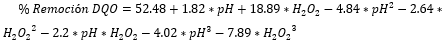 La figura 3 presenta la superficie de respuesta obtenida para describir la tendencia del porcentaje de remoción de DQO con respecto al pH inicial de la muestra y la dosis de H2O2, la ecuación que representa la superficie de respuesta corresponde a la ecuación 6.
