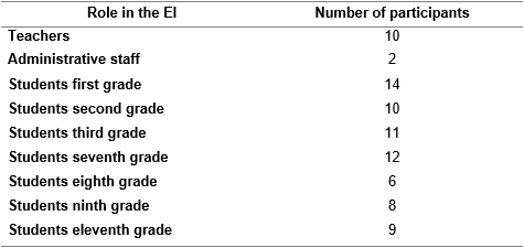 Eighty-two people who belong to this EI participated, including 10 teachers, 2 collaborators of the administrative staff, 35 students from the first, second and third grades corresponding to one of the headquarters of the educational establishment, and 35 students from the seventh, eighth, ninth and eleventh grades of the main headquarters of the institution. Two students and a teacher participated as key informants (Table 1). The participants were intentionally selected as key informants using the snowball sample technique, which suggests identifying cases of interest from a person who knows someone who may be a good candidate to participate (Martínez-Salgado, 2012).