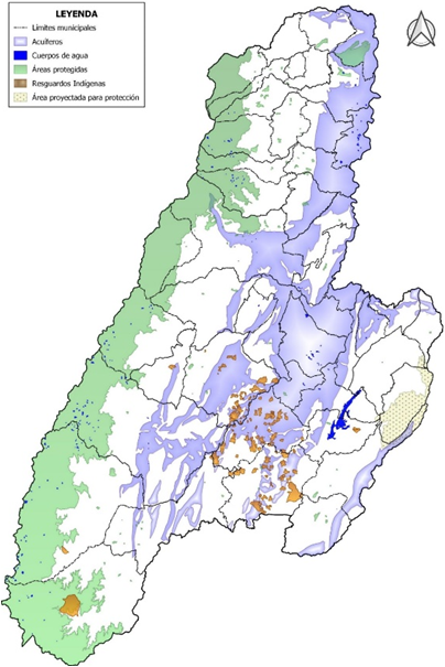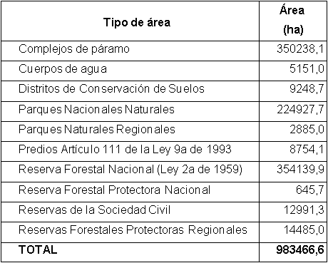 Al efectuar la sumatoria de las áreas señaladas se alcanza un total de 983.466,6 Ha, como se indica en la tabla 1; sin embargo, muchas de ellas se traslapan, por lo que la extensión real de ecosistemas bajo alguna figura de protección corresponde a 512.389,37 Ha (21% de la extensión departamental). De igual forma, se identificaron 614.700 Ha sobre seis sistemas de acuíferos o cuerpos de aguas subterráneas, 33.000 Ha en proceso de declaratoria como área protegida (Bosque de Galilea) y 29.300 Ha, tituladas colectivamente a comunidades indígenas en 86 Resguardos.