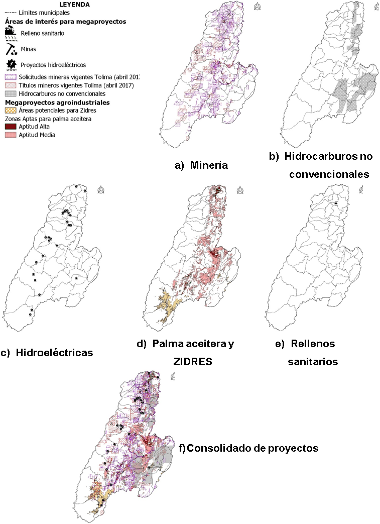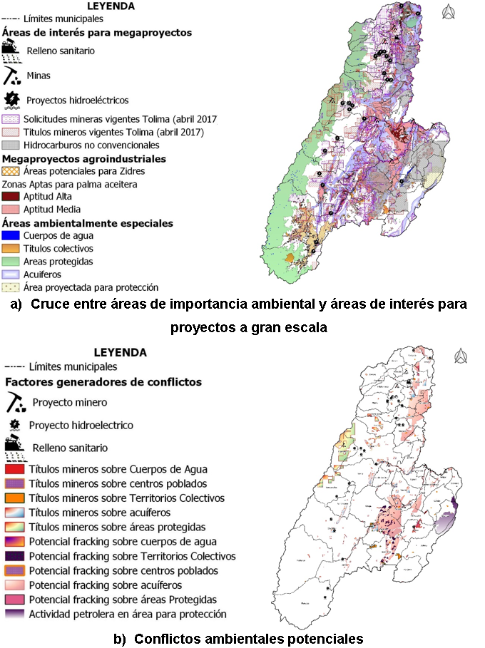 En la figura 2f se presenta un consolidado de lo que en este trabajo se denomina ordenamiento potencial del territorio del Tolima desde la perspectiva del modelo de desarrollo hegemónico, en el que se agrupan los diversos proyectos a gran escala señalados. Por su parte, la Figura 3a evidencia los cruces entre las áreas consideradas de especial significancia ambiental (áreas declaradas o en proceso de declaratoria como protegidas, acuíferos y resguardos indígenas) y las áreas de interés para megaproyectos mineros, hidroenergéticos, rellenos sanitarios y agroindustriales en el departamento.