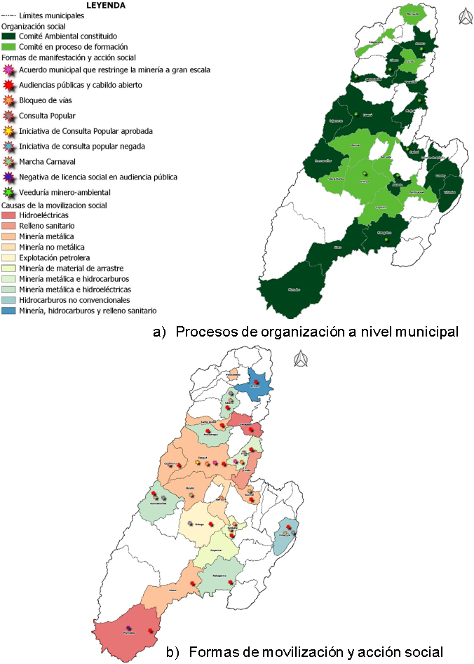 Para el análisis de la organización social se tuvo en cuenta la existencia y el nivel de consolidación de los Comités y Veedurías Ambientales municipales y regionales; en cuanto a las formas de movilización social, se hizo un inventario de las principales formas de convocatoria y acción social implementadas, tales como marchas, consultas populares, propuestas de acuerdos para restringir la minería a gran escala en los municipios, bloqueos de vías, audiencias para determinar la aprobación o negativa de la licencia social para proyectos minero-energéticos, audiencias públicas y cabildos abiertos, entre otros.