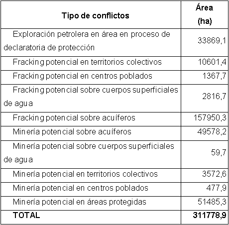 Variables y periodo de análisis: en lo que respecta a los conflictos potenciales se trabajó con base en dos tipos de áreas: en primer lugar las zonas consideradas como de importancia ambiental: Parques Nacionales Naturales, páramos, Reservas Forestales Nacionales, Reservas Regionales, Reservas de Cortolima, Reservas de la Sociedad Civil, humedales, cuerpos de agua, acuíferos, distritos de riego y resguardos indígenas; en segunda instancia se identificaron las áreas licenciadas, tituladas, solicitadas o proyectadas para proyectos mineros, de hidrocarburos no convencionales, hidroeléctricos, rellenos sanitarios y agroindustriales (Zonas de Interés de Desarrollo Rural, Económico y Social-ZIDRES y áreas con aptitud media y alta para el establecimiento de cultivos de palma de aceite).
