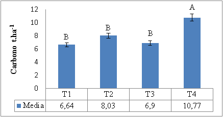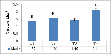 Carbono almacenado en la biomasa bajo el suelo (raíz y suelo). Según el ANDEVA, se encontraron diferencias estadísticas altamente significativas entre los tratamientos (p=0,001), y al aplicar la prueba de comparación de medias de Tukey se determinó que la mayor cantidad de carbono almacenado en la raíz se obtuvo en el T4 con un valor de 2,11 t.ha-1; el sistema que presentó un menor almacenamiento de carbono fue el T1 con un valor de 1,37 t.ha-1 como se muestra en la Figura 3. Esta variabilidad se debe a la heterogeneidad espacial del desarrollo del sistema radicular, el cual depende de las interacciones de los factores genéticos y ambientales de las especies. De acuerdo con Stokes et al. (2008), Katayama et al. (2009) y De Carvalho et al. (2016), la presencia del componente arbóreo promueve diferentes condiciones ambientales debido a la distancia de siembra y características morfológicas que influyen en el patrón de variabilidad espacial.