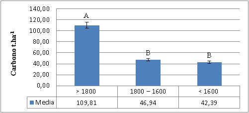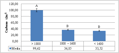 Al comparar el carbono almacenado en el suelo y al realizar el ANDEVA, no se encontraron diferencias estadísticas significativas entre los tratamientos (p=0,9577). Sin embargo, entre los tres rangos altitudinales se logró evidenciar diferencias altamente significativas (p=0,001); donde la mayor cantidad de carbono almacenado se encuentra presente en altitudes >1800 msnm, con un valor promedio de 99,62 t.ha-1, y el menor valor encontrado fue en el rango <1600 msnm con un valor promedio de 33,52 t.ha-1 como se observa en la Figura 4.