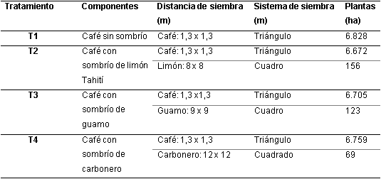 En los lotes experimentales de cuatro años de edad, se establecieron plantas de café variedad castillo y especies de sombrío como: limón Tahití (Citrus x latifolia; Tanaka ex Q. Jiménez), guamo (Inga densiflora Benth) y carbonero (Albizia carbonaria Britton).