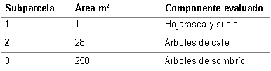 Para determinar las unidades de muestreo se adaptó el método de muestreo utilizado por Castellanos et al. (2010) del Centro de Estudios Ambientales y de Biodiversidad - Universidad del Valle de Guatemala (CEAB-UVG), el cual considera la estratificación y la distribución de puntos de muestreo de manera aleatoria. El primer paso consistió en dividir el área de cada uno de los tratamientos del lote experimental en unidades de muestreo. En este caso, se tomaron tres puntos al azar por tratamiento y en cada punto seleccionado se trazaron tres subparcelas anidadas en círculo concéntrico (Tabla 2).
