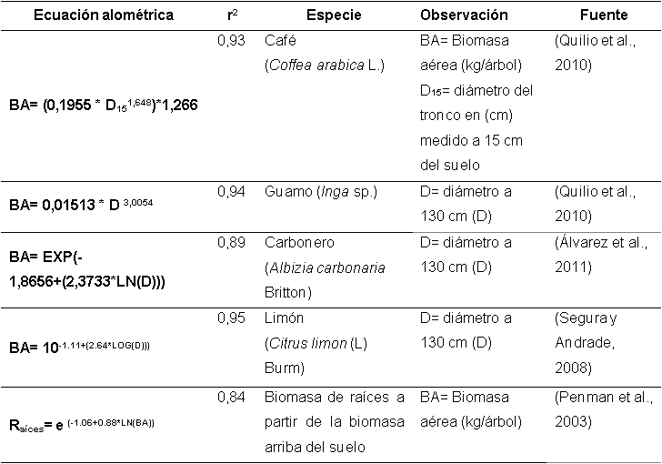 Para determinar el carbono almacenado en árboles de café y sombrío, el valor de la biomasa se obtuvo a través de las ecuaciones alométricas formuladas para cada especie (Tabla 3). La ecuación establecida para limón está dada de manera general para frutales y la empleada en carbonero es utilizada en especies arbóreas de bosque húmedo premontano (Álvarez et al., 2011).