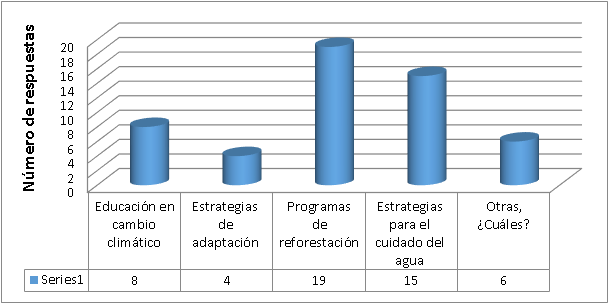 De manera complementaria, a pesar de no tener muy claras las acciones que se han venido avanzando en el municipio frente a cambio climático, el 57% de los encuestados considera que las autoridades ambientales, como lo son la Secretaría de Ambiente del municipio y la Corporación Autónoma de Cundinamarca —CAR—, sí han apoyado procesos e iniciativas que incentivan el conocimiento sobre cambio climático en los productores rurales, pero en términos generales todos los encuestados consideran que falta mucho compromiso con las comunidades rurales. La acción mencionada con mayor frecuencia es la participación en actividades de concientización en colegios y escuelas de la región, a través de charlas y actividades con los estudiantes. Por otro lado, solo algunos mencionan que las autoridades han apoyado concientizando directamente a los campesinos sobre la importancia de mantener los bosques y no talarlos, promoviendo a su vez actividades de reforestación y en general siembra de especies vegetales. Finalmente, solo algunos encuestados expresan que en algunas oportunidades se ha avanzado en jornadas de capacitación, campañas de reciclaje.