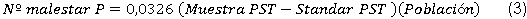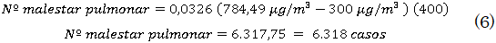 Adicionalmente, se utilizó la ecuación brindada por Matos Barrionuevo (2010), la cual determina el número de casos de malestar pulmonar, es decir, enfermedades respiratorias como ataques asmáticos y enfermedades vías aéreas, en relación con la concentración de Partículas Suspendidas Totales (PST). Así pues, la ecuación (3) toma una muestra en específico del contaminante, el estándar del contaminante según la normatividad colombiana y la muestra poblacional como variables para estimar el número de casos.