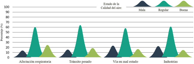 En cuanto a las causas de la contaminación atmosférica, la población identificó el sector del transporte urbano como la principal problemática atmosférica con un 60%. Es decir que en cada uno de los barrios el sector transporte fue señalado como la causa de mayor afectación de la calidad del aire con más del 50 % de la población por sector; sin embargo, el 82% de la población encuestada identificó a las industrias como el factor más cercano a sus lugares de permanencia. A pesar que el tránsito pesado fue señalado como un factor constante en los cinco lugares de estudio (62%), las personas podrían estar identificando al transporte sobre las industrias por ser este un factor con el que están en contacto en su día a día.