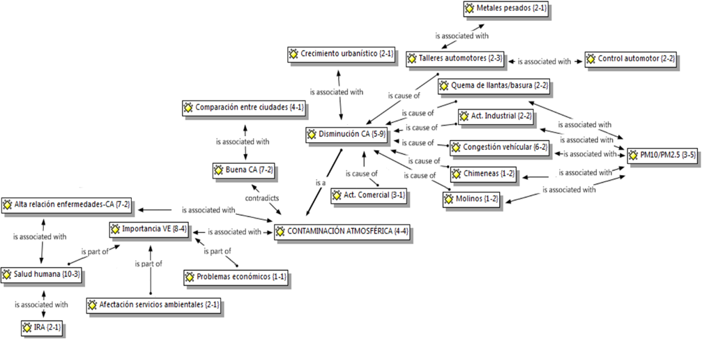 La Figura 3 y la Figura 4 representan los mapas de relacionamiento semántico a partir de las entrevistas realizadas a cinco investigadores de calidad del aire y gestión ambiental en la ciudad. La Figura 3 agrupa las preguntas sobre percepción de la calidad del aire, la necesidad de conocer el valor económico de los efectos contaminantes del aire, y el relacionamiento entre las enfermedades respiratorias y la contaminación atmosférica. Así pues, cuando se les preguntó a los investigadores sobre la calidad del aire en la ciudad, manifestaron ser relativamente buena si es comparada con otras ciudades como Bogotá o Medellín. A pesar de no señalar el estado de la calidad del aire como mala, señalaron estar disminuyendo en varios puntos de la ciudad, puesto que existe presencia de chimeneas, molinos, quema de llantas/basura y, por último, tráfico vehicular, el cual fue señalado como el de mayor influencia por los entrevistados. Asimismo, se describió la presencia de partículas suspendidas en el ambiente a partir de las causantes mencionadas, así como la presencia de metales pesados en las zonas con afluencia de talleres automotores.