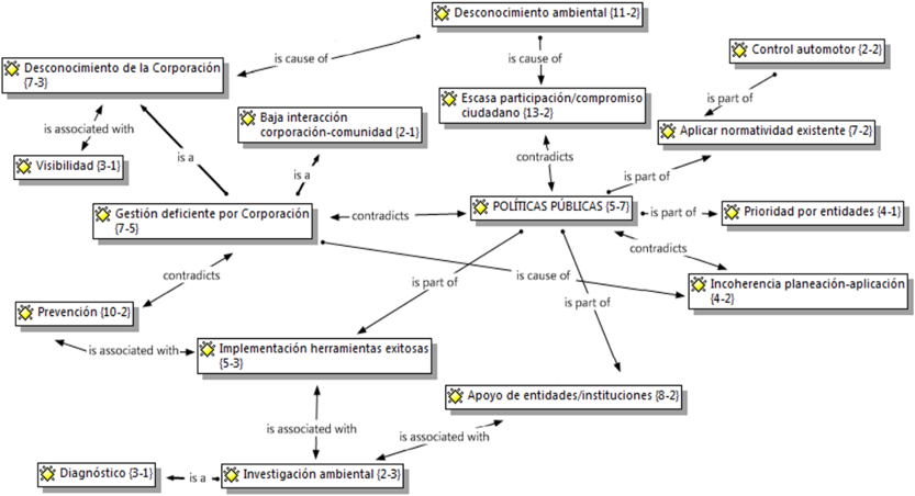 Así pues, se realizaron cinco entrevistas a investigadores en la temática de gestión ambiental y calidad del aire. Se establecieron cinco preguntas de tipo abierta, dicotómica y mixta, dirigidas principalmente a la percepción de la contaminación del aire en la ciudad y sobre el seguimiento a políticas públicas en el tema. Estas entrevistas fueron realizadas de manera presencial y grabadas para la posterior elaboración de un análisis semántico en el software ATLAS.ti (ATLAS.ti Scientific Software Development GmbH, 2011), el cual permitió analizar las palabras claves de mayor repetición entre los entrevistados y por ende, las de mayor importancia en torno a la temática. Una vez transcritas las entrevistas a formato de texto para su ingreso al software, se prosiguió a segmentar en formato de citas la información brindada por los entrevistados. Luego, se realizó la codificación de las categorías, la cual viene representada por una palabra o frase corta que representa en esencia una porción de la información (Saldaña, 2009). Cada código fue vinculado con otros códigos para establecer sus relaciones y poder generar una red conceptual, brindando así la posibilidad de establecer un análisis semántico a partir de la información brindada por los entrevistados.