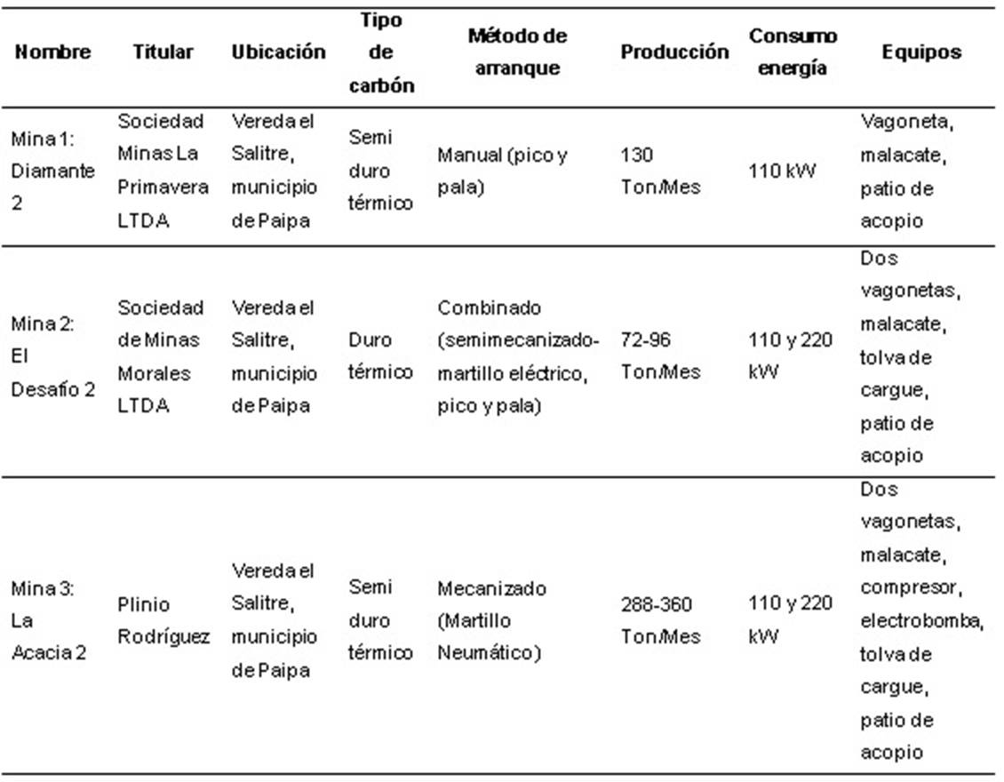 En el municipio de Paipa existen alrededor de 41 títulos para pequeña minería, adjudicados para la explotación y beneficio de carbón (térmico y metalúrgico) (Agencia Nacional de Minería [ANM], 2017); para esta investigación se tuvieron en cuenta tres minas, cada una ubicada en un distinto título minero, pero las cuales desarrollan el proceso de explotación en la misma vereda, denominada el Salitre, se incluyeron estas minas teniendo en cuenta la legalidad minera y la disponibilidad de los titulares de suministrar información cuantitativa. Así mismo, se eligió el tipo de carbón térmico cuyas características permitieron definir que un factor diferencial fuese el método de arranque, tal como se muestra en la tabla 1: