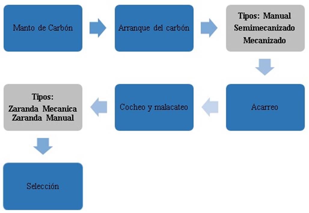 • Arranque del carbón: esta minería a pequeña y mediana escala se realiza con técnicas manuales como el uso de pico y pala, técnicas semimecanizadas (manual y martillo eléctrico) o por medio de técnicas mecanizadas usando únicamente el martillo eléctrico.