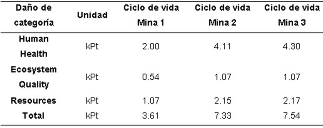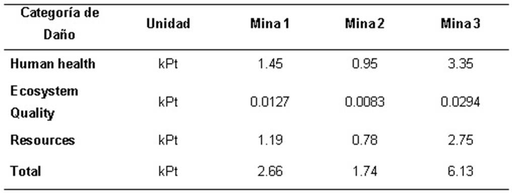Se analizó el impacto ambiental del ciclo de vida de cada mina, comparando las técnicas de explotación, las herramientas y sus materiales, así como sus respectivos consumos energéticos; los resultados obtenidos del EICV se presentan en Ecopuntos (kPt) para cada categoría de impacto provisto por el Europe Eco-indicador 99 H/A, los resultados de la evaluación se describen a continuación (tabla 2).