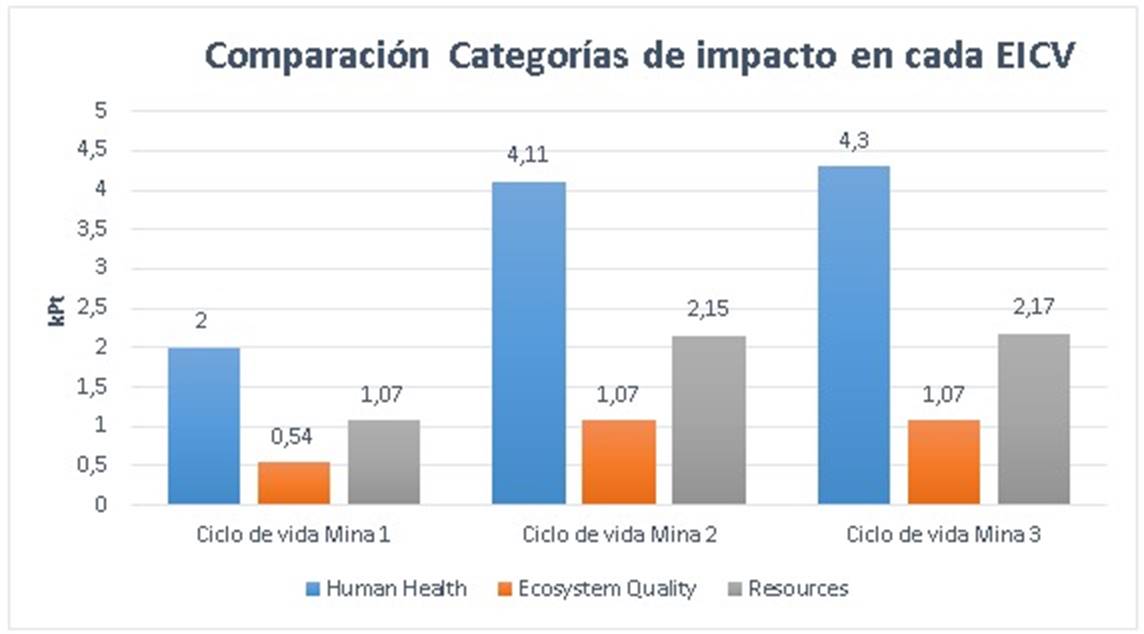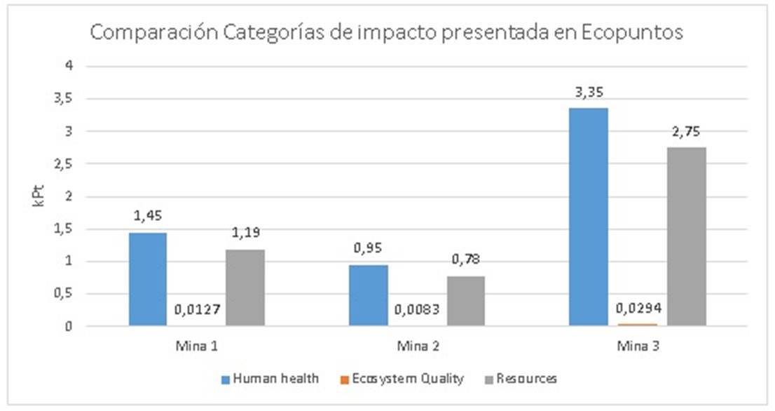 Según los resultados, la mina que mayor impacto genera de acuerdo con la cantidad de toneladas explotadas mensualmente es la mina 3, además de ser la que más consumo energético tiene y la que mayor cantidad de toneladas mensuales explota; impactando en gran medida a la categoría de la salud humana, seguido del impacto a los recursos naturales y la calidad de los ecosistemas. También se observa que en este caso la mina 2 es la que menor impacto genera en todas las categorías de daño, hay que tener en cuenta que este resultado se debe a que esta mina es la que menos cantidad explota en toneladas mensuales de las tres.