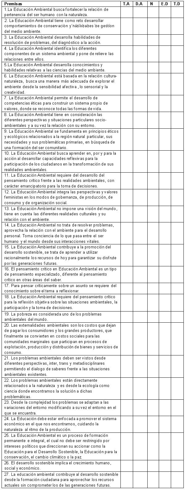 Para la presente investigación se determinó que las técnicas a aplicar serian el cuestionario -teniendo como instrumento la escala Likert- y la técnica de entrevista semiestructurada -teniendo como instrumento los grupos de discusión por institución-. La escala Likert busca dar afirmaciones que reflejen actitudes positivas o negativas con respecto a la concepción de Educación Ambiental para poder, a partir del análisis del instrumento, iniciar un proceso de categorización. La Escala Likert (ver Anexo 1) consta de 27 premisas, siendo la valoración de 1 “completamente de acuerdo” y la valoración de 5 “completamente en desacuerdo”, cada premisa fue validada por pares internacionales. En la escala Likert se plantearon 27 premisas, las primeras 15 premisas con una premisa de relación directa a cada una de las corrientes, las premisas 16 y 17 buscan determinar la importancia del pensamiento crítico y el pensamiento crítico especializado en la Educación Ambiental, de las premisas 18 en adelante se plantean posturas que pueden acercarse a una o varias corrientes. Estadísticamente, los resultados obtenidos a la muestra aplicada fueron analizados con el programa Statistical Package of the Social Sciences (SPSS) presentando un Alpha de Chronbach de 0,817 para las 27 premisas.