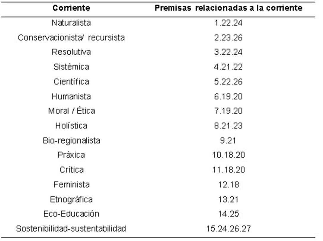 De la premisa 1 a la 15 están relacionadas directamente con el concepto de educación ambiental, mientras las premisas 22 a la 27 fueron sobre el abordaje de las problemáticas de la educación ambiental relacionadas con una o más corrientes.