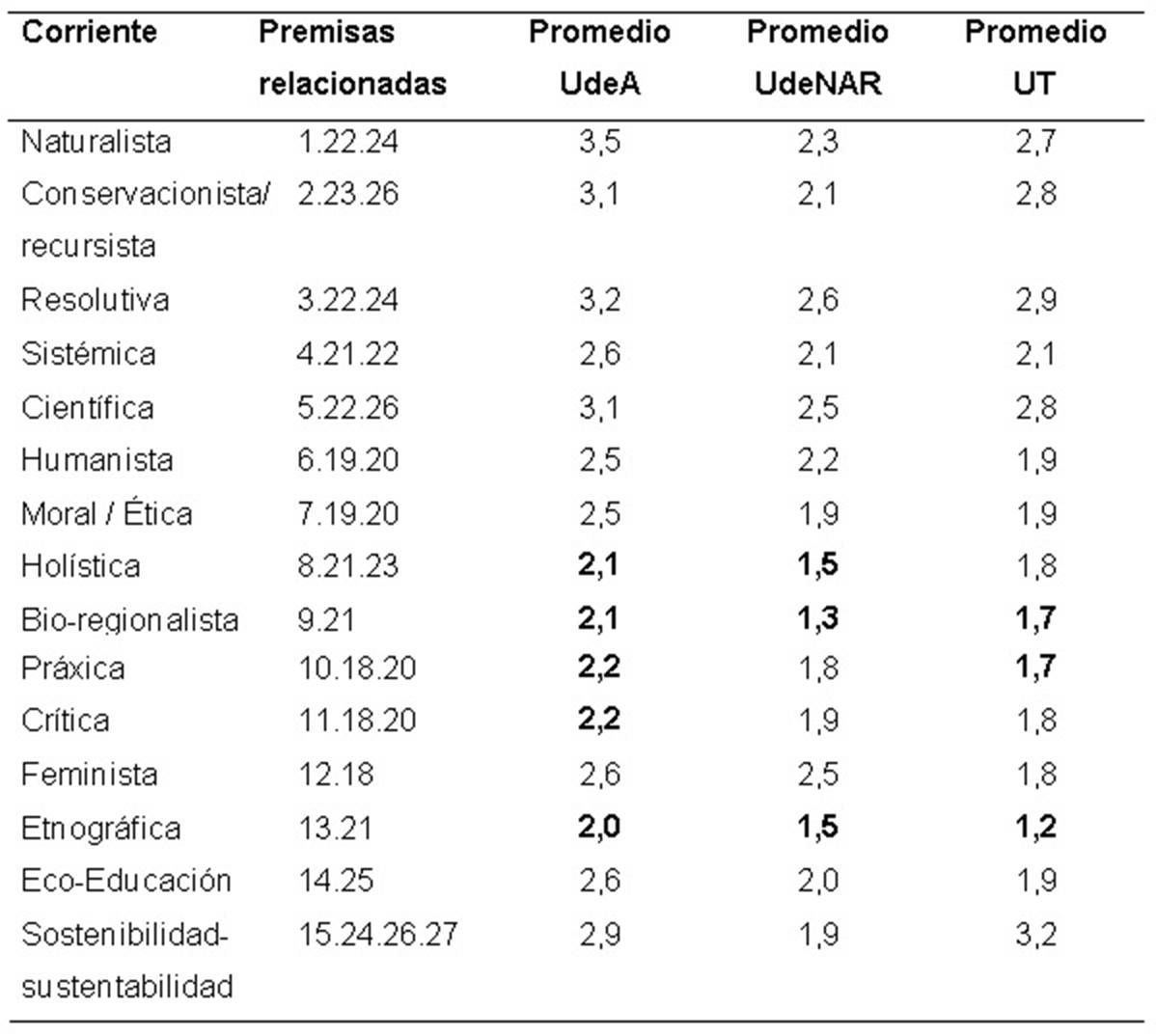 En la población de la Universidad de Nariño, existe una fuerte tendencia a la corriente bio regionalista -premisas 9 y 21 con promedio de 1,3-; seguida de la corriente etnográfica –premisa 13 y 21 con promedio de 1,5-; seguida de la corriente holística -premisa 8, 21 y 23 con promedio de 1,5-. La tendencia más fuerte en los estudiantes de Licenciatura en Educación Básica con énfasis en Ciencias Naturales y Educación Ambiental, dadas las respuestas a las premisas relacionadas a cada corriente, se encuentran dirigidas a las corrientes bioregionalista, la corriente etnográfica y la regionalista, respectivamente.