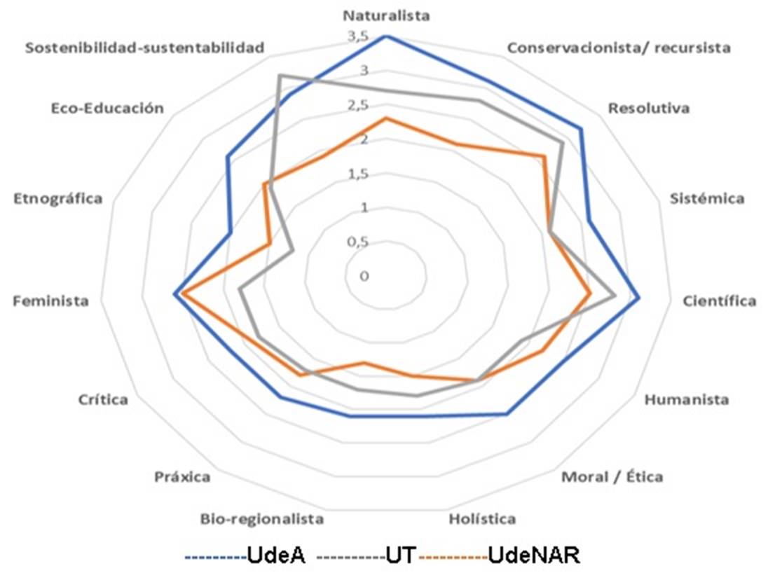 En las concepciones sistémica, moral/ética, práxica, crítica y eco-educación se refleja un fuerte acercamiento entre lo planteado por los estudiantes de la Universidad de Nariño y la Universidad del Tolima, dirigido a la concordancia con las descripciones conceptuales de la corriente y evidenciándose un claro distanciamiento con la postura de los estudiantes de la Universidad de Antioquia. En la corriente feminista se evidencia un acercamiento entre la Universidad de Antioquia y la Universidad de Nariño evidenciándose un distanciamiento con la postura de los estudiantes de la Universidad del Tolima. En las corrientes Naturalista, conservacionista/recursista, científica, humanista, holística, bioregionalista, etnográfica y sostenibilidad/sustentabilidad se evidencian distanciamientos entre las posturas conceptuales de las tres poblaciones de estudiantes.