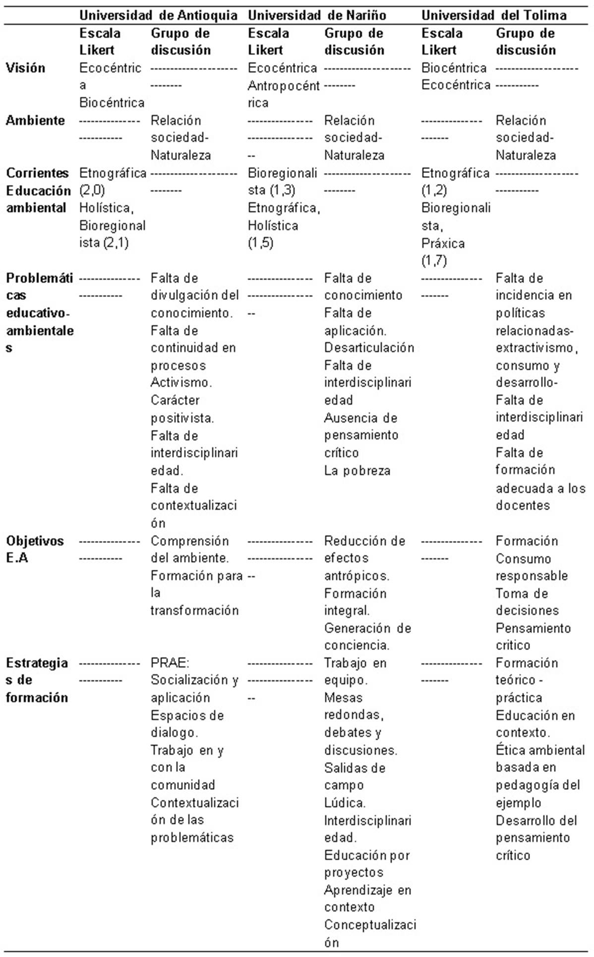 Respecto a la concepción de educación ambiental, con base en lo obtenido por los instrumentos, se logró determinar que en la Universidad de Antioquia predominan características de las corrientes: etnográfica, holística y bioregionalista; en la Universidad de Nariño las corrientes bioregionalista, etnográfica y holística, y en la Universidad del Tolima las corrientes: etnográfica, bioregionalista y práxica. Los resultados obtenidos evidencian transformaciones conceptuales en las visiones tradicionalmente hegemónicas de educación ambiental en estudiantes de Licenciatura en Ciencias Naturales en formación como lo son la corriente tradicionalista, conservacionista, resolutivo, humanista y naturalista (Rodríguez y Tamayo, 2011).