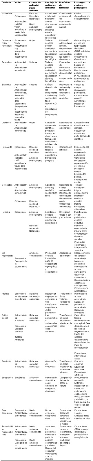 Para el presente trabajo de investigación, se partió del análisis de los autores a la cartografía de corrientes en educación ambiental planteada por Sauvé (2004) caracterizado desde las categorías de visión de la relación humana con el mundo como lo son la visión antropocéntrica, biocéntrica y ecocéntrica (Foladori, 2005), la concepción de ambiente o medio ambiente, el abordaje de las corrientes a las problemáticas educativo-ambientales, el propósito de formación y las estrategias o modelos pedagógicos:
