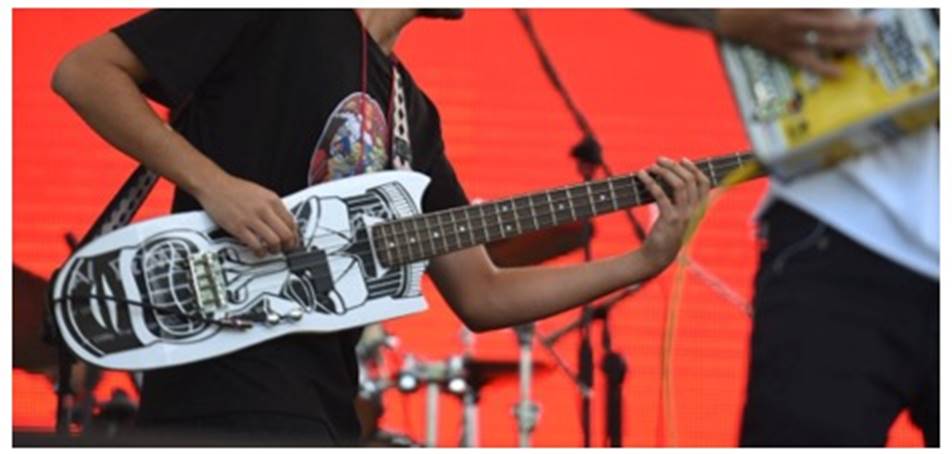 Mi instrumento son dos patinetas que están prensadas […] se llama Tablajo [Figura 2] […] El objetivo del instrumento ha sido, más que nada, comunicar el mensaje de que las cosas que nosotros creemos que ya no funcionan o que se tienen que desechar porque ya no tienen más usos […] pues que solamente es de reinventarse […] simplemente es cuestión de creatividad.