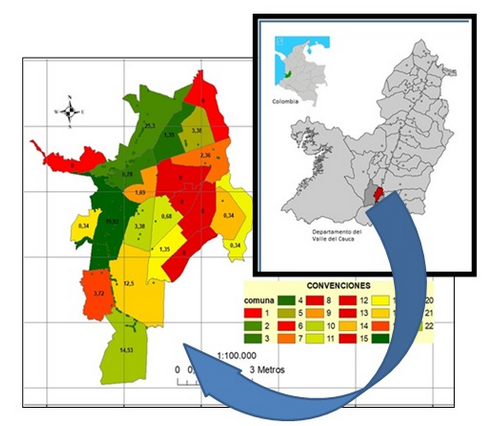 Cali es la segunda ciudad más extensa de Colombia, al poseer un área de 564 km² y una longitud de 17 km de Sur a Norte y 12 km de Oriente a Occidente; presenta una altitud de 995 m s. n. m. y un clima de 23ºC (Alcaldía Santiago de Cali, 2017).
