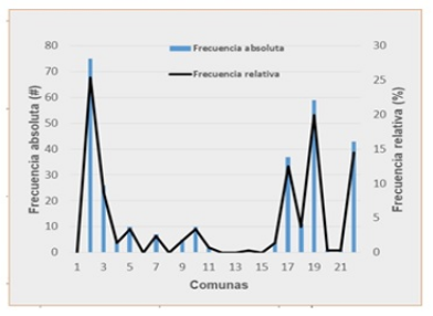 Las especies localizadas en los emplazamientos están distribuidos en las diferentes comunas de Cali. En algunas de estas comunas (p. ej. 1, 8 12, 15) no fue encontrado algún individuo forestal como notable, por lo cual aquí no se hizo la declaratoria de árboles notables (figura 2).
