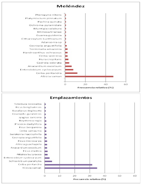Por su parte, en el campus de Meléndez de la Universidad del Valle, el 47,58% de los individuos forestales seleccionados como árboles notables corresponden a las especies Albizia saman (59 individuos forestales) y Ceiba pentandra (15 individuos forestales) con el 12,10%, resaltándose la importancia de estas. Seguido de Enterolobium cyclocarpum (10 individuos forestales) con el 8,06%, Anacardium excelsum (8 individuos forestales) con el 6,45% y Cedrela odorata (5 individuos forestales) con el 4,03%. Cabe resaltar que el 21,72% de las especies restantes se encuentran representadas por menos de 3 individuos forestales. La cifra de los individuos arbóreos mencionada corresponde a la clasificación de árboles notables en el municipio (convenio) y dentro de la sede Meléndez de la Universidad del Valle y dicha clasificación la realizaron teniendo en cuenta los criterios establecidos en el POT. En la tabla siguiente, se señalan las especies clasificadas como árboles notables, tomando la base de datos del censo arbóreo de Santiago de Cali realizado por el convenio mencionado en líneas anteriores en el 2016 y la base de datos del inventario, realizado en la Sede Meléndez de la Universidad del Valle.