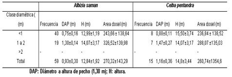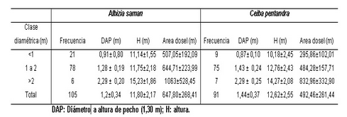 Los valores de altura de las dos especies encontrados en este estudio son mucho menores a los encontrados por Moya y Muñoz (2010) en plantaciones más jóvenes de ocho especies comerciales monitoreadas en Costa Rica, incluso; sin embargo, los DAP de A. saman y C. pentandra (0,99-1,44 m) son valores mucho más altos que los reportados para especies maderables en el estudio citado, que oscilaron entre 0,18 y 0,37 m. También, Tenorio et al. (2016) reportaron alturas mayores y DAP menores de otras cinco especies. Incluido una variedad de samán (Samanea saman) presentó una altura mayor (16,3 m) que la altura media reportada en este estudio y un DAP menor a las especies aquí estudiadas.