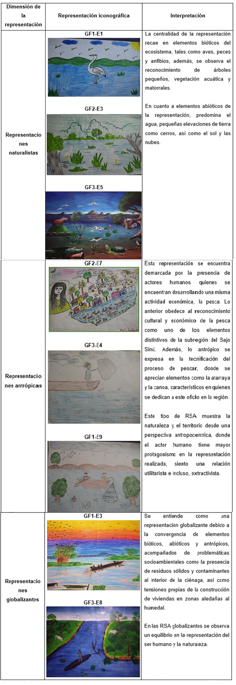 Las representaciones gráficas de la CGBS se organizaron a partir de la clasificación de las RSA propuesta por Reigota (1995). Gran parte de ellas corresponde a las representaciones naturalistas, seguidas de las antrópicas y, en menor medida, se encontraron las de tipo globalizantes (Tabla 1).