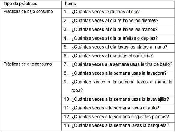 Las prácticas domésticas del uso y manejo del agua están divididas en bajo consumo de agua, que son actividades que se realizan con menor frecuencia al día; y alto consumo de agua, que son aquellas que se efectúan con mayor recurrencia en la semana. A partir de esta clasificación se creó una escala, la cual concentra a los dos tipos (bajo y alto consumo).