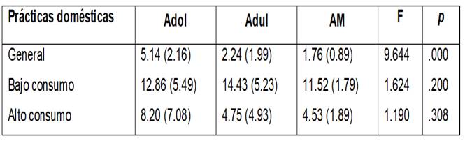 El último análisis se realizó con el cruce de la escala de prácticas domésticas y el grupo de edad de los encuestados. A partir del análisis de medias realizado con el test de ANOVA, se obtuvo un resultado significativo de la escala de prácticas domésticas en general por grupos de edad [F(2, 161)= 9.644, p≤0.001], siendo los adolescentes quienes poseen mayores prácticas domésticas a diferencia de los adultos y adultos mayores. A su vez, los adultos poseen más prácticas que los adultos mayores. No se observan diferencias significativas entre las medias en las prácticas domésticas de bajo consumo [F(2, 175)= 1.624, p≥0.05], ni en las de alto consumo [F(2, 123)= 1.190, p≥0.05] (Tabla 2).