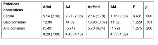 Además, se compararon cuatro grupos de edad con los dos tipos de prácticas domésticas y no se encontraron diferencias estadísticamente significativas. En las prácticas de bajo consumo [F(3, 1174)= 1.229, p≥0.05] y las prácticas de alto consumo [F(3, 122)= 1.275, p≥0.05], lo cual nos hace pensar que resulta interesante la exploración de las características propias de los adolescentes para comprender el comportamiento ambiental peculiar en este segmento de la población.