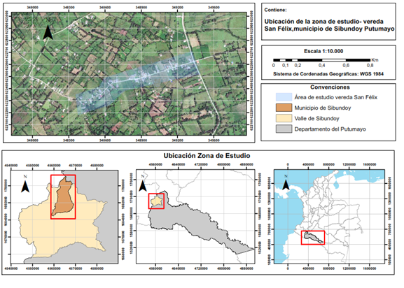 La vereda San Félix se encuentra ubicada en el municipio de Sibundoy, departamento del Putumayo-Colombia, localizada a 1° 10' 34.67” de latitud Norte y 76° 55' 04.33 de longitud Oeste, a una altura entre los 2.000 y 2.150 msnm, con temperatura promedio anual de 15°C; precipitación, entre 1.443 y 1.496 mm y humedad relativa anual de 78% y 83%, (Palacios y Barrientos, 2014). Según la clasificación de Holdrige (1982) la región pertenece a la zona de vida Bosque muy húmedo montano bajo (BMH-mb). (Figura 1).