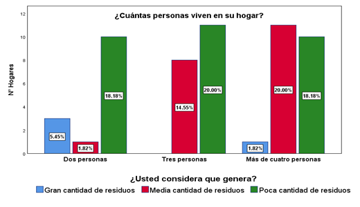 Los datos muestran que, en los hogares conformados por dos personas, el 5,45% (3 familias) generan una gran cantidad de residuos sólidos inorgánicos, el 1,82% (1 familia) genera una cantidad moderada y el 18,18% (10 familias) considera que su generación es baja. En los hogares de tres integrantes, el 14,55% (9 familias) señalan que producen residuos en una cantidad promedio, mientras que el 20% (11 familias) indican que su generación es baja. Por otro lado, en los hogares con más de cuatro integrantes, el 1,82% (1 familia) afirma que produce residuos en un volumen considerable, el 20% (11 familias) generan una cantidad intermedia y el 18,18% (10 familias) consideran que su generación es baja.