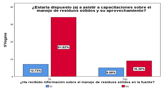 Los datos indican que 41 familias expresaron disposición para asistir a las capacitaciones, de las cuales el 12,73% (8 hogares) indicó haber recibido información sobre el manejo de residuos sólidos en la fuente, mientras que el 61,82% (33 familias) señaló no tener conocimiento previo sobre esta temática. Por otro lado, 14 familias no mostraron disposición para participar en el proceso de educación ambiental; entre ellas, un 9,09% (9 hogares) afirmó haber recibido información, y el 16,36% (5 unidades familiares) indicaron no haber sido capacitadas.