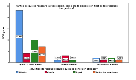 En la comunidad, 44 familias realizan la quema a cielo abierto como método de eliminación de residuos. De estas, el 41,82% quema plástico como tratamiento final, el 7,27% utiliza esta práctica para cartón y el 18,18% para papel. Otra práctica identificada es el enterramiento de residuos: el 1,82% de las familias entierra plástico, el 5,45% cartón y el 1,82% papel. Además, 6 familias vierten los residuos directamente al suelo, con un 3,64% que desecha papel de esta manera, un 1,82% que utiliza esta técnica para cartón y otro 3,64% para papel.