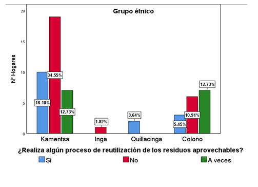 Los resultados indican que el 34,55% (19 familias) de la comunidad indígena Kamëntsa no realiza ningún proceso de reutilización de residuos, mientras que el 18,18% (10 familias) reutiliza materiales como papel y plástico, y el 12,73% (8 familias) afirma que a veces aprovecha los residuos. En el grupo indígena Quillacinga, el 3,64% (2 familias) reutiliza residuos inorgánicos. Mientras que el 12,73% de las familias del grupo étnico colono señala que a veces reutiliza residuos aprovechables, frente al 10,91% que no realiza ninguna práctica de reciclaje. En general, el 47,28% de las familias pertenecientes a las comunidades Inga, Kamëntsa y colono no realizan ningún tipo de aprovechamiento de residuos, mientras que el 27,27% sí lo hace.