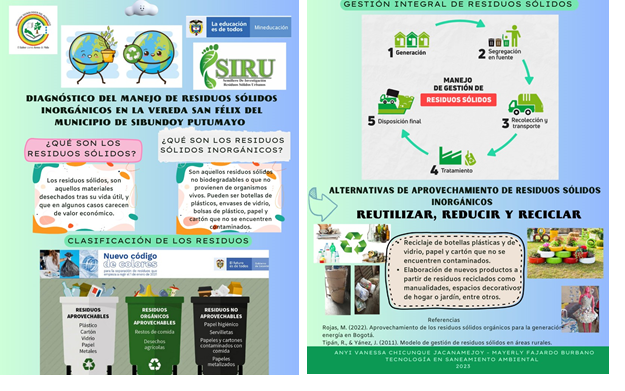 Abstract: Introduction: The inadequate management of inorganic solid waste remains a significant environmental challenge in rural areas. Objective: To diagnose current waste management practices and propose viable strategies for the utilization of inorganic waste in the rural and indigenous communities of San Félix, Sibundoy Municipality, Putumayo, Colombia. Materials and Methods: This study employed a mixed-methods approach within an action research framework. Semi-structured surveys were administered to a representative sample of 55 families. Quantitative data were analyzed using IBM SPSS Statistics 21, and the study incorporated a civic environmental education project entitled Environmental Awareness Strategies for the Proper Management of Inorganic Solid Waste. Results: In the absence of an integrated collection and transport system, final waste disposal is primarily conducted through burning and soil dumping, especially for plastic and paper. These practices reveal a critical lack of reuse systems and limited access to information or training regarding proper inorganic waste management. Temporarily, households store waste materials such as plastic, cardboard, and paper in plastic bags or polyethylene sacks. Conclusions: Waste management in San Félix faces considerable limitations due to a lack of institutional support and training, leading to environmentally harmful disposal methods. Implementing sustainable strategies and strengthening environmental education are essential for promoting waste reduction, source separation, and resource recovery.